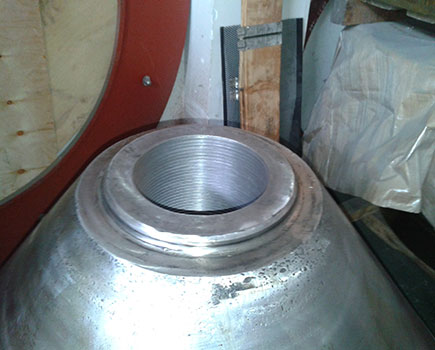 2014-06-10 客戶HP500 破碎機(jī)動錐體在更換襯板時發(fā)現(xiàn)鎖緊螺栓不能拆卸,運(yùn)到我公司維修。由我司技術(shù)人員判定為動錐體內(nèi)螺紋損壞,同時檢查動錐體外錐面,發(fā)現(xiàn)磨損嚴(yán)重。