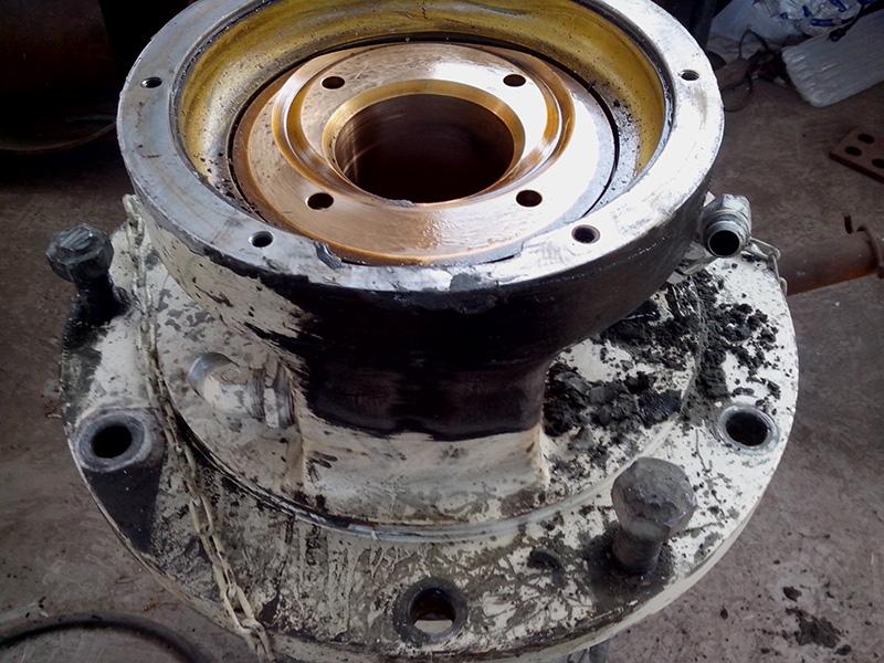 2014-06-09 客戶HP500圓錐破碎機(jī)的水平軸殼體因過(guò)度磨損不能繼續(xù)使用,運(yùn)到我公司維修。由我司技術(shù)人員拆解水平軸總成,更換新的水平軸殼體,銅套,護(hù)板。